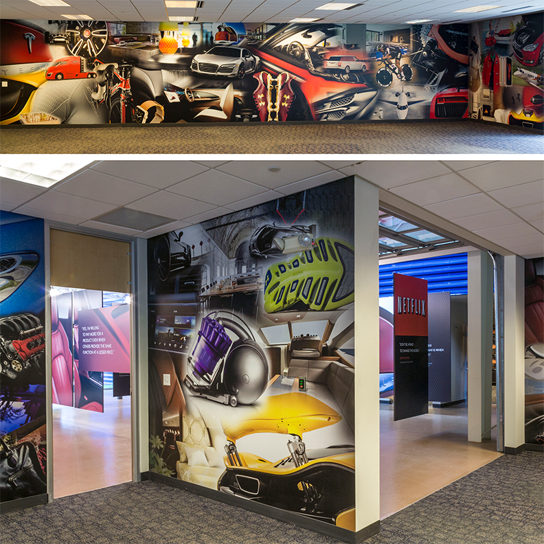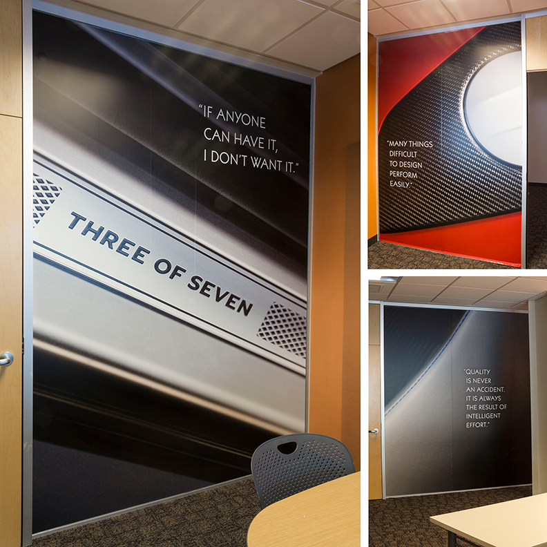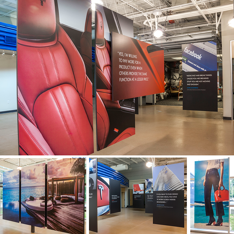 A vacant facility was transformed into an inspiration studio. Large, strategically-placed graphic panels showing luxury images intermixed with quotes from innovators and trailblazers