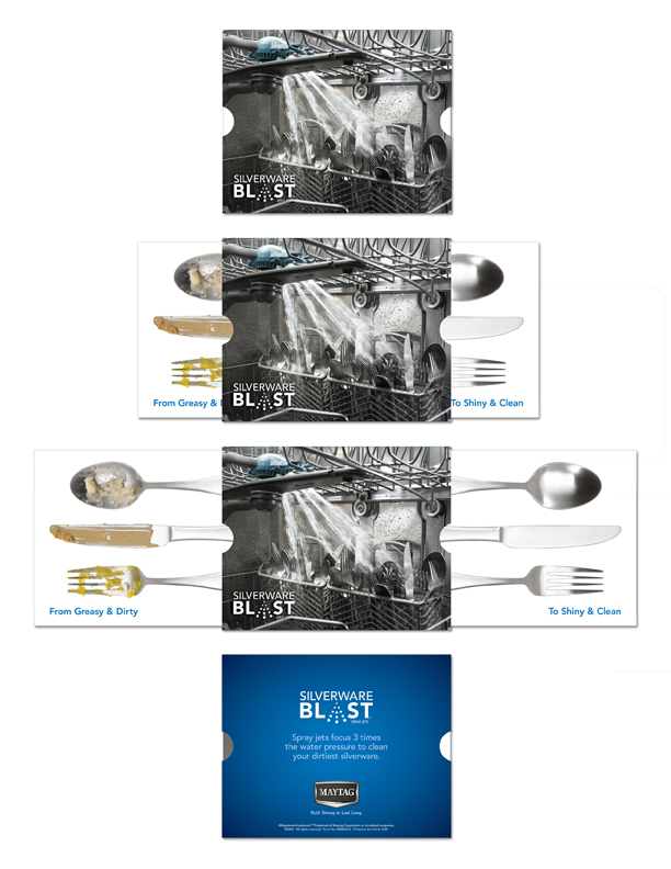 The laundry launch materials received an AAF-Michiana Gold ADDY award. The SilverwareBlast dishwasher piece received an AAF-Michiana Gold ADDY award.